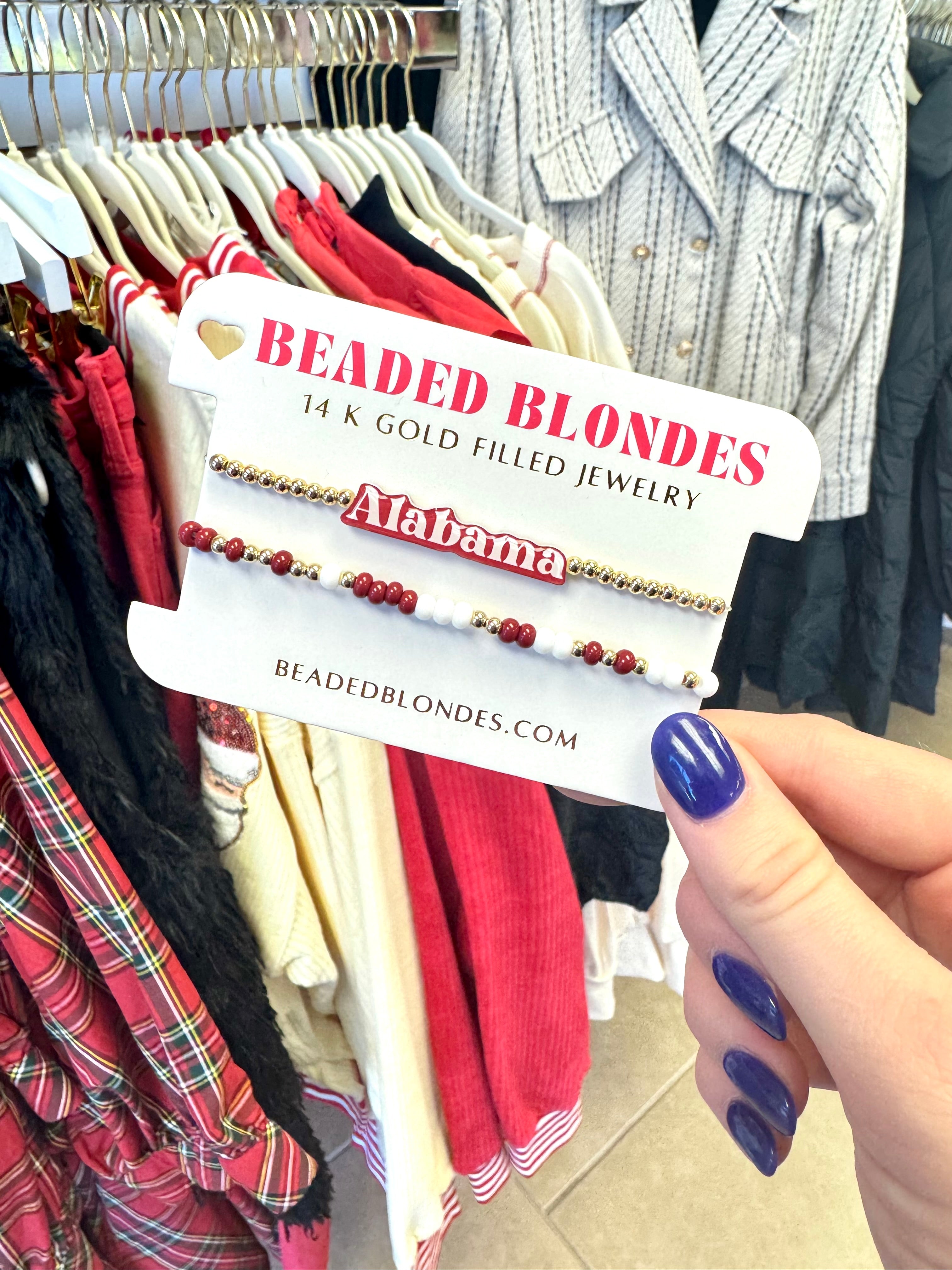 The Bama Sprinkle Bracelet Set is perfect for the stylish Alabama fan. This two piece set features 14K gold filled beaded bracelets with custom made beads. The sturdy elastic string ensures durability, while the tarnish proof beads add an extra touch of luxury. Roll tide!
