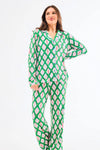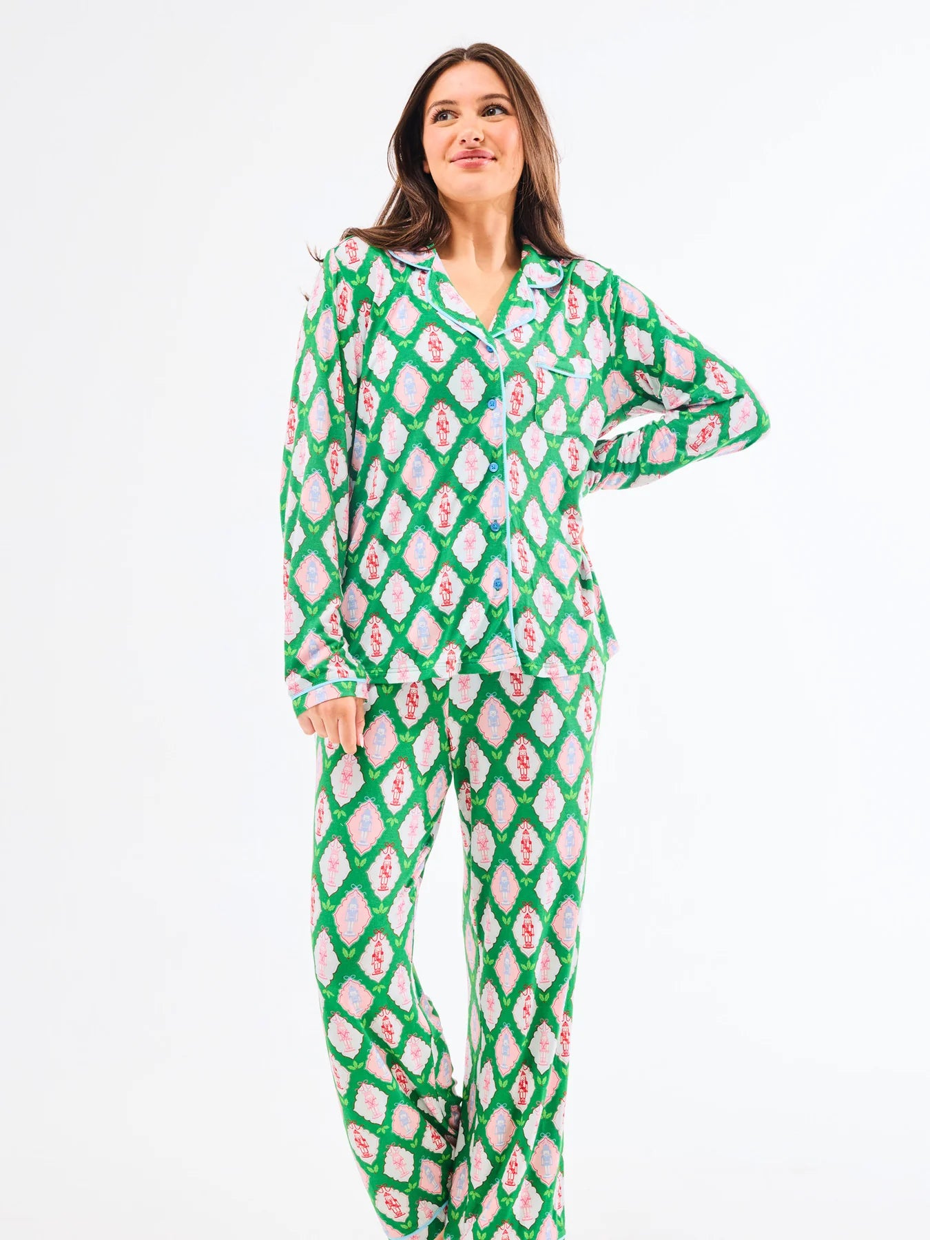 These green long-sleeve button-up pajamas feature pants adorned with a playful nutcracker design. Extra soft and cozy, they’re just right for festive family nights and holiday fun.