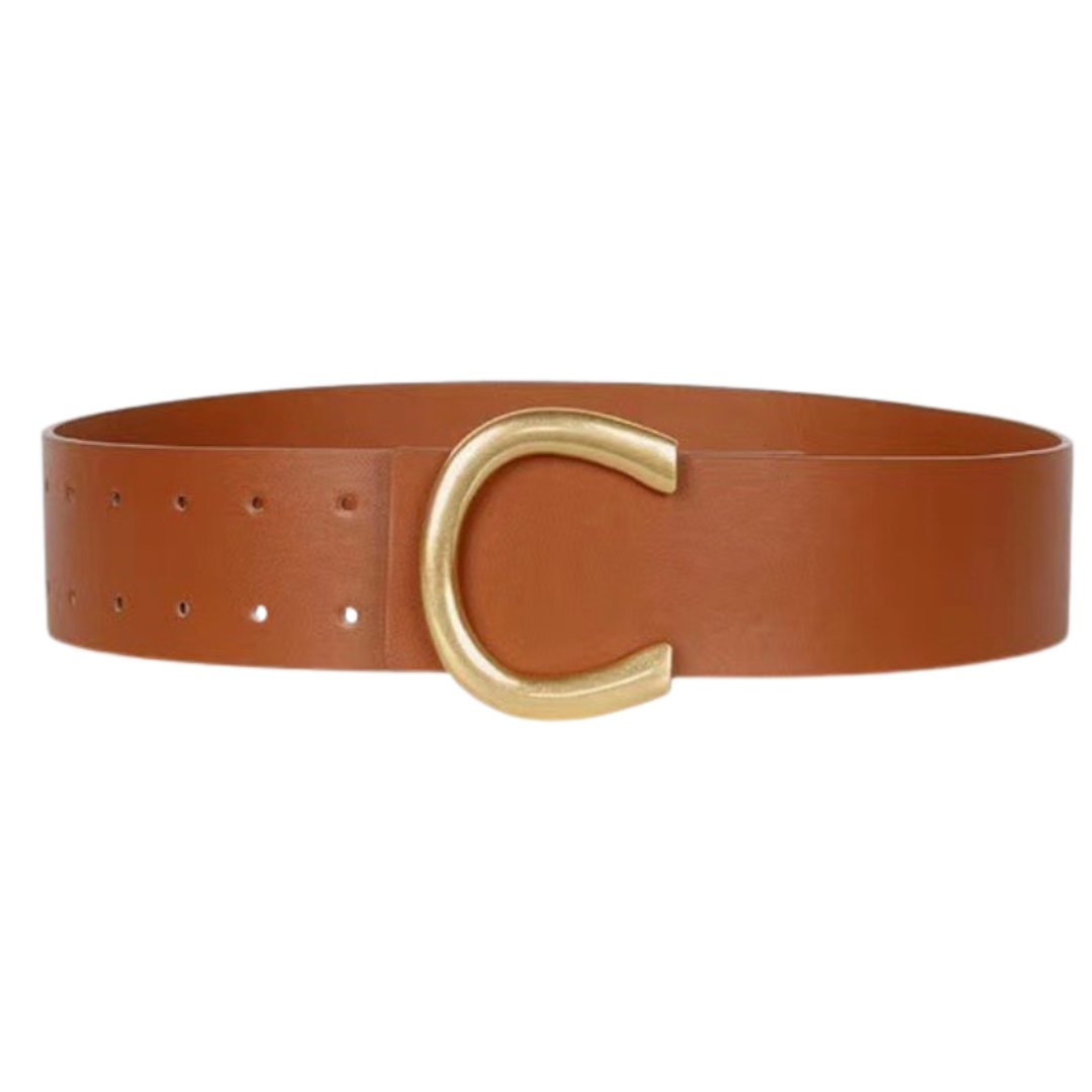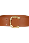 Cinch your silhouette with this cognac vegan leather belt, designed to complete any dress with effortless polish. The wide 2.25" band pairs beautifully with the modern gold-plated horseshoe buckle, creating a statement accessory that bridges casual and formal wear. 40" for a customized fit, this sustainable leather belt brings refined elegance to your everyday wardrobe and special occasions alike.