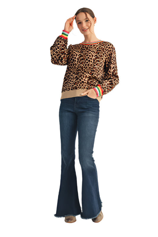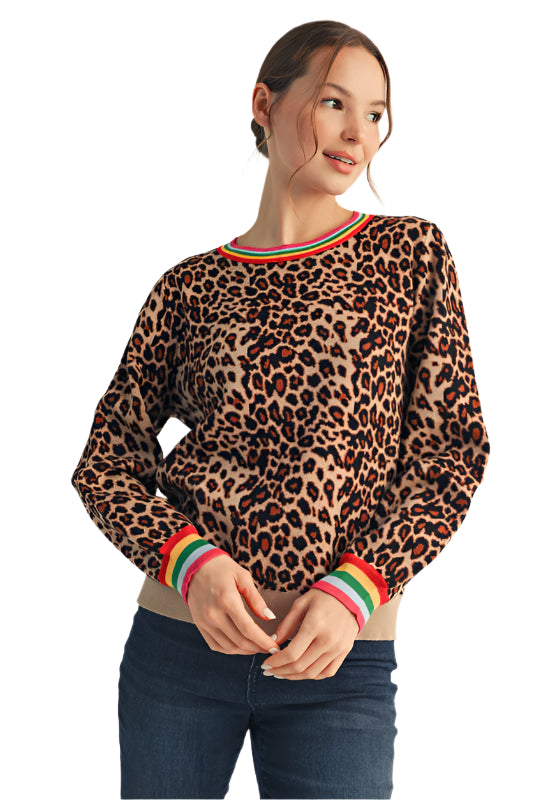 Cozy up in the Wild Wonders Sweater, featuring a soft, comfy fabric and a playful leopard print accented with vibrant rainbow trim. Its classic crew neck and traditional fit make it perfect for layering this fall. Available in sizes Small to 2X, it’s the fun, stylish way to brighten your cooler days.
