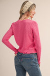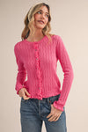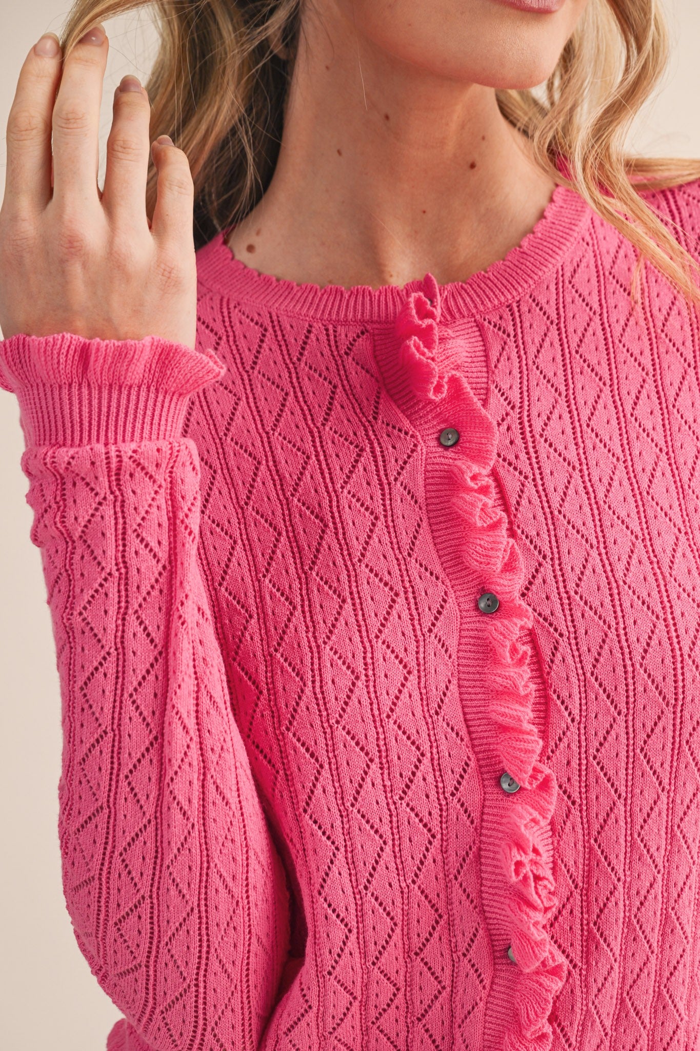 Meet your new go-to layer! This pointelle knit cardigan brings the perfect blend of sweet and sophisticated. The fitted bodice skims your curves while the scalloped neckline and ruffled button placket add playful details that feel fresh and fun. Long fitted sleeves keep things polished without sacrificing comfort. Throw it on over a dress or tee for instant charm that works from brunch to sunset strolls.
