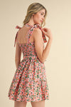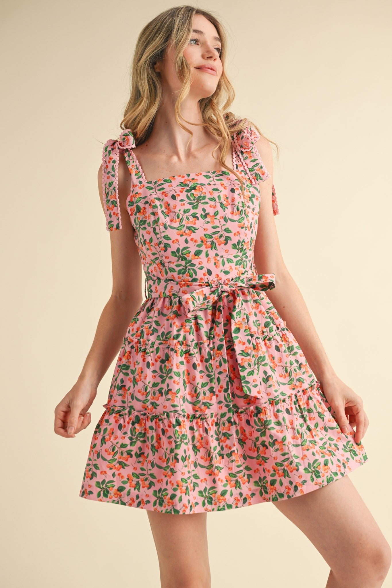 Twirl into spring with this charming ruffle tiered skirt, with tie strap mini dress! Featuring a sweet cherry print and flattering square neckline, it's designed to turn heads. The wide shoulder straps are trimmed with delicate crochet lace, while a fitted waist with tying sash cinches you in just right. The smocked elastic back ensures comfort all day long, and the tiered ruffle hem adds that perfect flirty touch. Practical pockets keep your essentials close, and the lined interior means you're ready for anything. Pure joy in every wear.