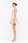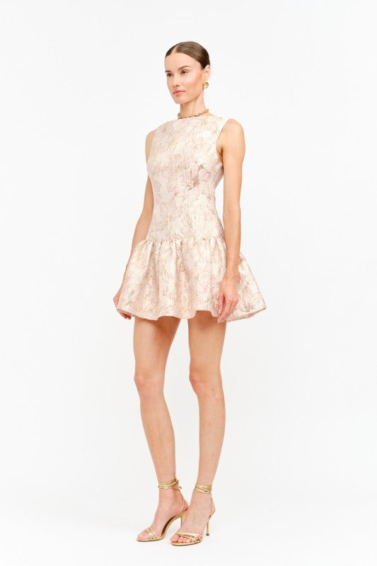 Radiant and refined—this jacquard mini dress captures the essence of golden hour with its luminous blush hue and delicate floral weave. The structured bodice highlights the waist before flowing into a flirty drop-waist skirt, creating a silhouette that's both elegant and playful. Crafted from soft jacquard fabric with a subtle metallic sheen, this sleeveless wonder features a flared hemline and convenient back zip closure. Perfect for those moments when you want to feel effortlessly chic and utterly enchanting.