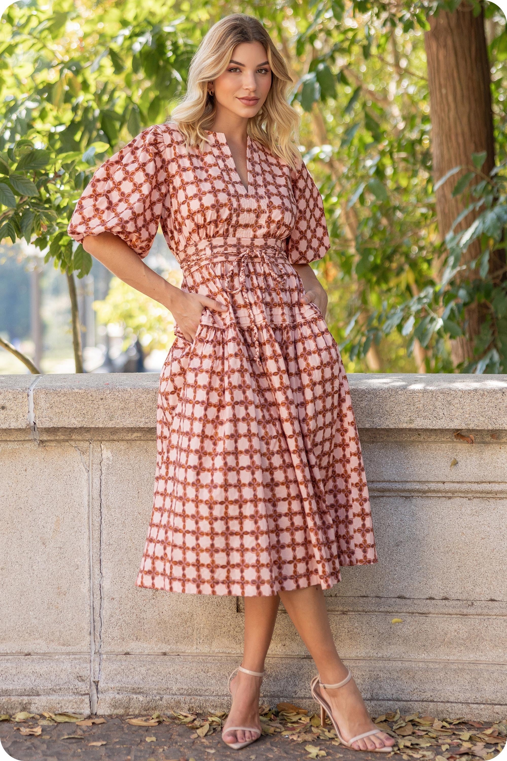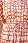Embrace a feminine vibe with the Georgia On My Mind Dress, featuring a stunning modern print in smokey salmon and burnt sienna. Its flattering v-neck and relaxed bubble sleeves add effortless charm, while the obi waist belt highlights your silhouette. The drop waist design creates a playful, flowing shape—making it the perfect dress for everything from daytime adventures to casual dates.