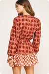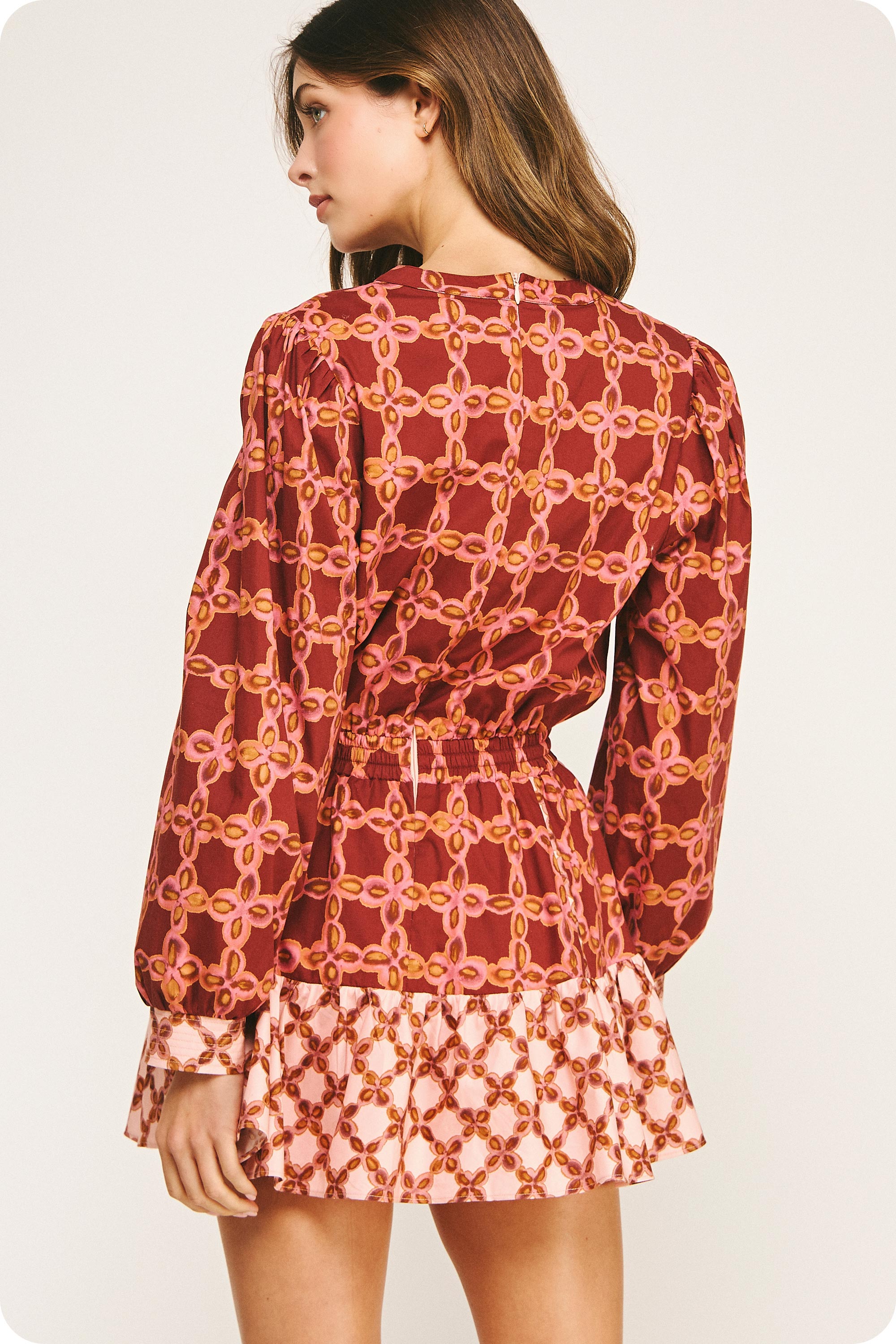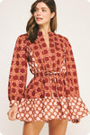 This playful Miranda Print Mini Dress is perfect for fall, combining two eye-catching patterns for a fresh, stylish look. Featuring long sleeves and a drawstring waist, it offers a comfy, adjustable fit. The tiered short skirt adds a flirty touch, making it a fun choice for any autumn date outing.