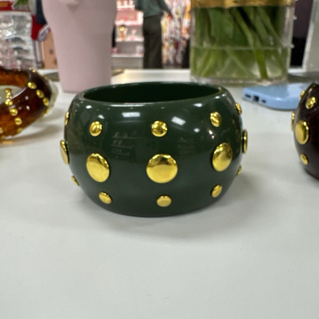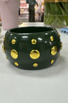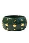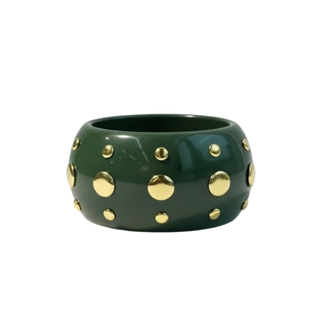 The Bowie Bangle in palm green resin, adorned with gleaming gold studs, commands attention with understated elegance. This oversized statement piece transitions seamlessly from season to season, offering a refined touch to any ensemble. The striking contrast between rich green and lustrous gold creates a timeless aesthetic that elevates everyday wear into something extraordinary. Perfect for those who appreciate bold, intentional accessories that speak to refined taste.