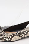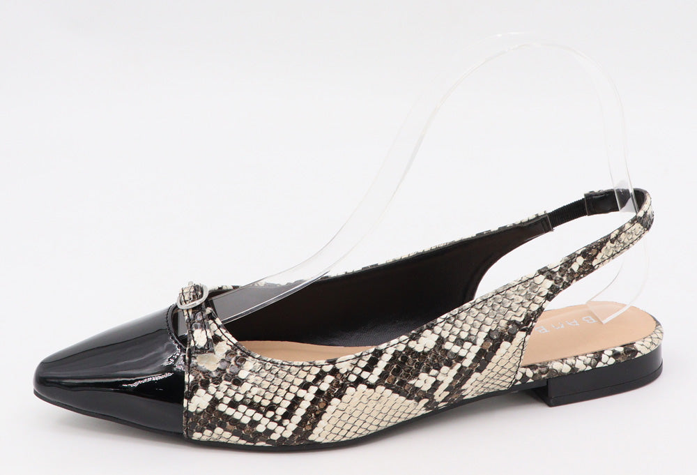 Put a fun and fashionable foot forward with the Visor Python Shoe. Featuring a glossy black patent toe and a striking python print slingback body, these flat shoes bring a playful edge to any outfit. Perfect for dressing up or keeping it casual with jeans, they offer comfort and style in every step.