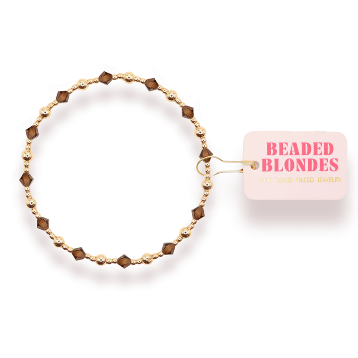 Sparkle through your day with the June Bracelet, a playful mix of 2MM and 4MM gold beads paired with shimmering Swarovski crystals in a warm cocoa brown palette. Handstrung with care in College Station, Texas using 14K gold-filled materials and durable elastic string, this beauty is built to keep up with your lifestyle—waterproof, workout-proof, and tarnish-proof. Whether you're hitting the gym or heading out for the evening, June brings just the right amount of glimmer without the fuss.