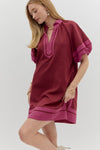 The Asher mini dress brings playful charm with its solid contrast accents and short lantern sleeves. Featuring a high neck split collar band and a flirty slit hem, this lined pullover dress combines comfort with a stylish edge perfect for any fun occasion.