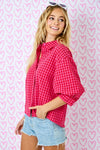 Introducing the Check Please Shirt—your new go-to for effortless style! This relaxed button-up features a classic collar and playful 3/4 balloon sleeves that add just the right amount of flair. The easy fit keeps things comfortable all day long, while the stunning red and pink color combo brings personality to any outfit. Whether you're dressing it up or keeping it casual, this shirt strikes the perfect balance between put-together and laid-back cool.