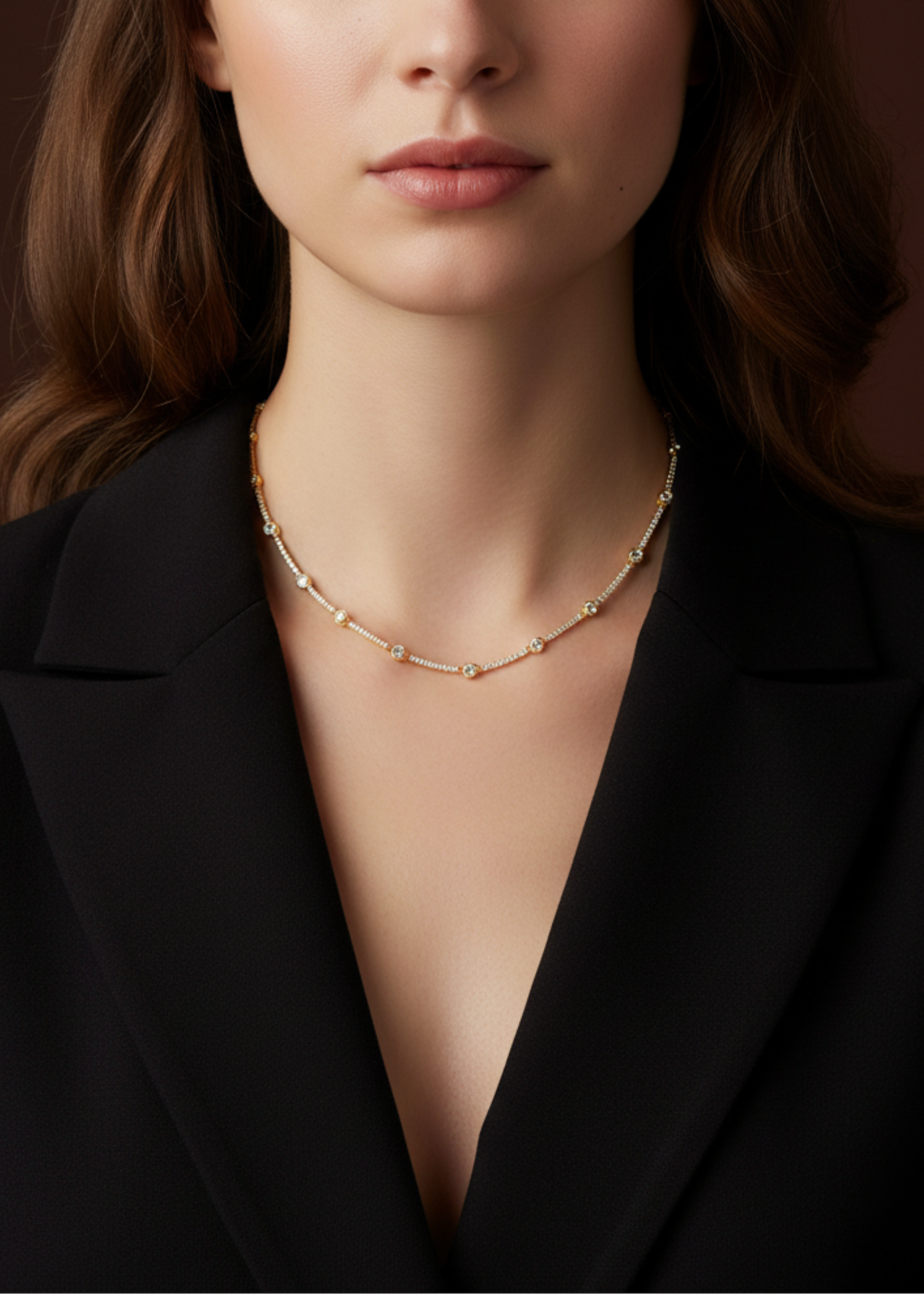 Elevate your everyday sparkle with this stunning Diamond Station Necklace! Featuring a lustrous stainless steel base kissed with luxe gold plating, this 16" beauty showcases brilliant high-quality CZ stones that catch the light beautifully. Perfect for layering or wearing solo, it's the ideal accessory to add a touch of glamour to any outfit. Versatile, durable, and absolutely dazzling!
