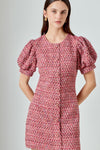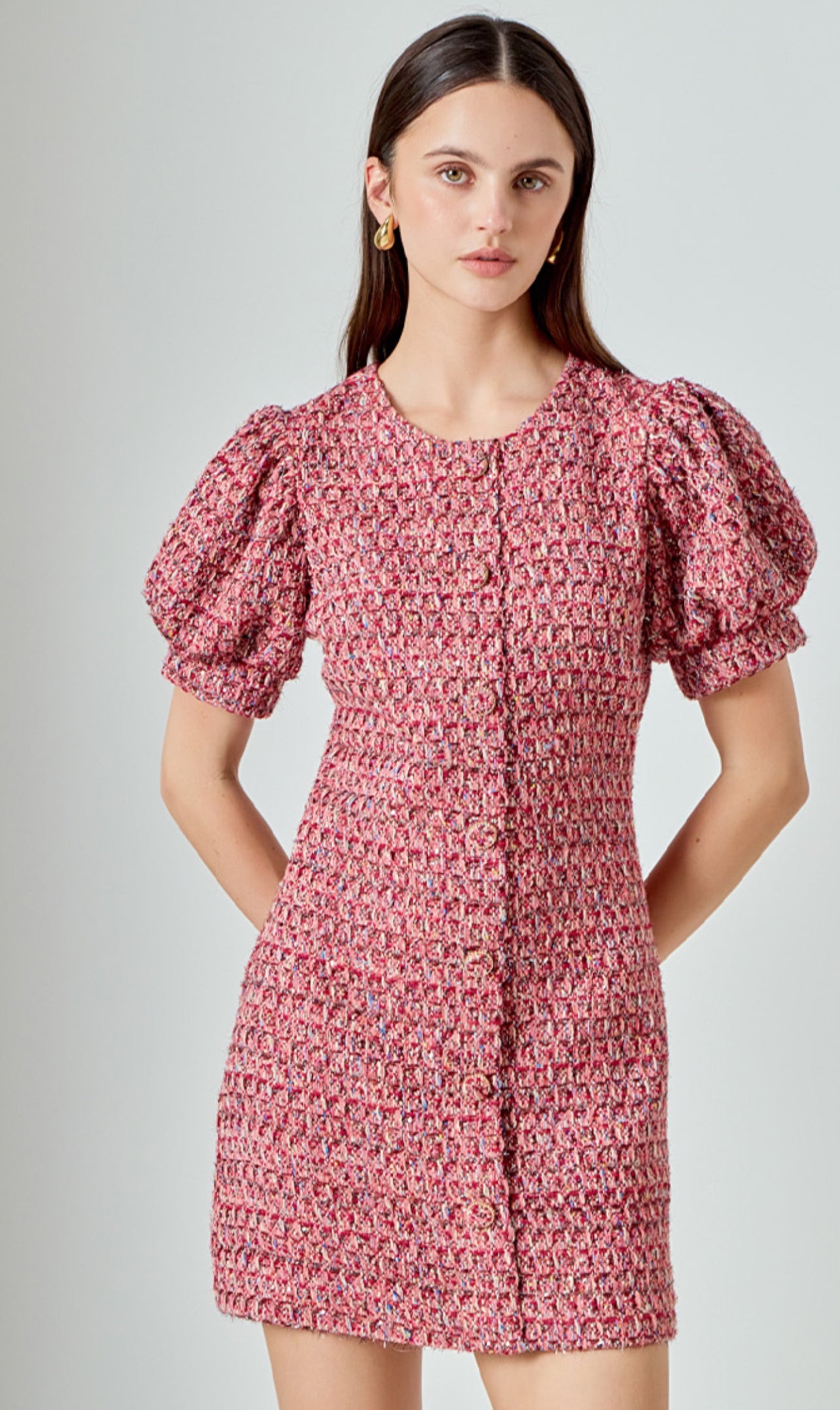 Step into the season with the Coco Berry Tweed Fall Dress, where classic tweed meets a subtle shimmer for a hint of sparkle. Its short cuffed sleeves and button-front design bring playful charm, perfect for holiday gatherings or stylish luncheons. This dress effortlessly blends comfort and festive flair for your standout moments.