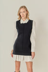 This playful Wednesday Shirt Dress blends a crisp white cotton shirt peeking from beneath a sleek black knit tank dress for a modern, stylish vibe. With long sleeves and a mini length, it offers both comfort and a fun twist on layering that keeps you ready for anything with ease and flair.