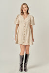 This playful mini dress features frayed fabric stripes that add a touch of luxe texture. Balloon sleeves bring a fun, voluminous flair, while brass buttons down the front add charming detail. Perfect for turning heads with effortless style.