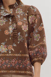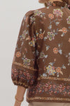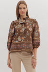 Brighten your wardrobe with the Frances Fall Floral Blouse, featuring a playful floral print and charming ruffled split neck. The 3/4 sleeves with elastic cuffs add a flirty touch, while the partial button front lets you adjust your look with ease. Lightweight and unlined, this top is perfect for layering or wearing solo for a breezy, fun vibe all season long.
