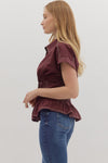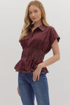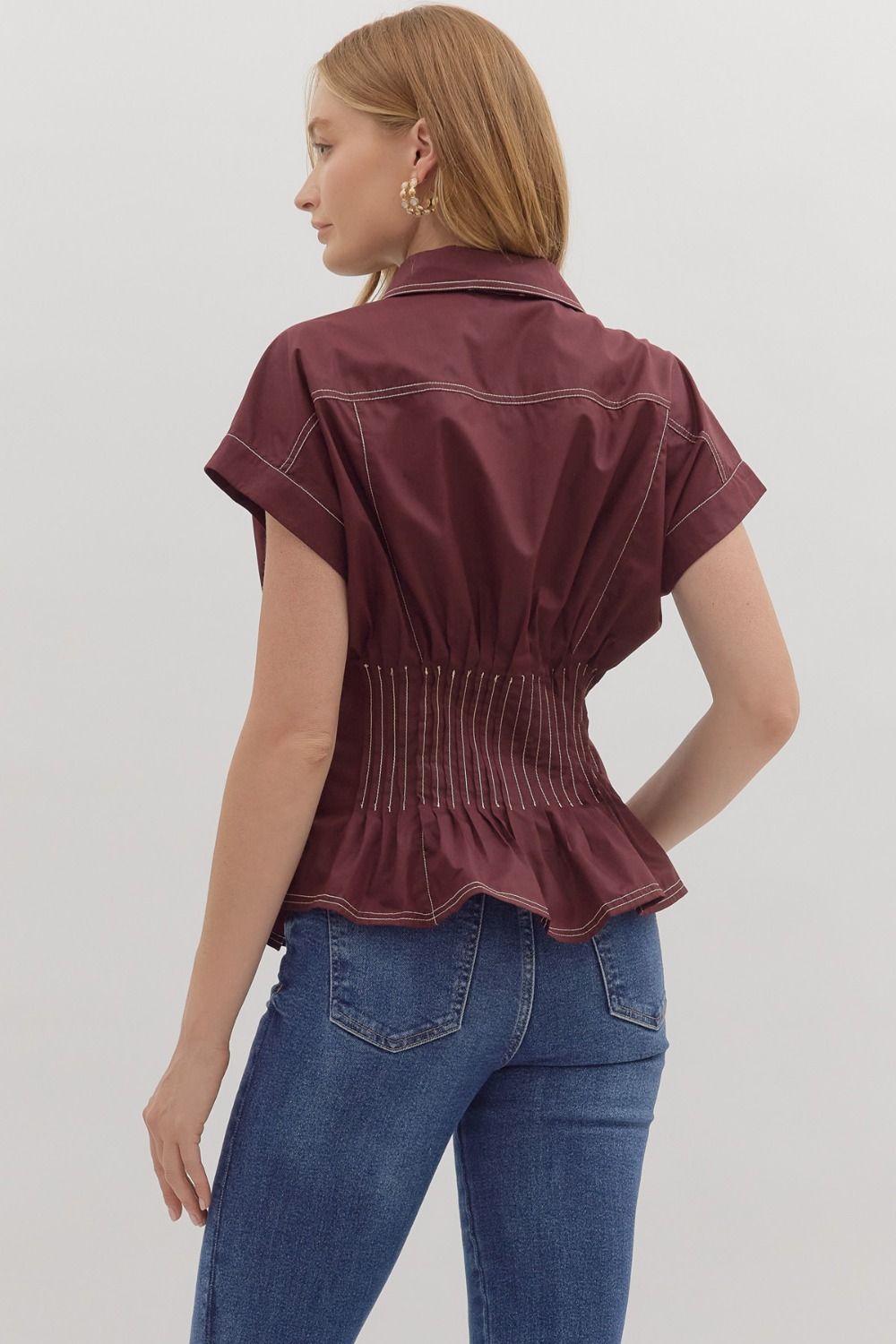 This playful short sleeve peplum top in a rich eggplant shade adds a fun twist to your wardrobe. The contrast stitched smocked waist shapes your silhouette while the front button closure keeps it easy and breezy. Crafted from lightweight woven fabric and unlined for ultimate comfort, it’s perfect for mixing and matching with your favorite jeans or skirts.