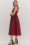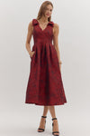 Step into festive fun with the Realyn Holiday Dress. This floral jacquard midi dress features playful bow accents on the shoulder straps and a flirty pleated skirt that sways with every step. Convenient side pockets add a touch of practicality, while the back zip closure ensures a perfect fit. Unlined for lightness and ease, it’s your go-to dress for dancing through the holidays in style.
