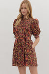 Step into autumn with the Ella Fall Cotton Dress, a playful mini dress featuring a collarless design and charming slight puff short sleeves. Its rich wine color is adorned with a gorgeous fall flower print, perfectly capturing the season’s spirit. The included belt cinches your waist for a flattering silhouette, making this dress a fun and flirty choice for any fall outing.