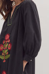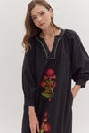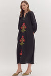 Step into fall with the Callie Fall Midi Dress, where cozy vibes meet playful charm. This embroidered floral maxi dress flaunts a contrast trim V-neck and flirty side slits for an easy, breezy feel. Buttoned cuffs add a sweet touch, while a handy side pocket keeps essentials close. Fully lined for comfort, it’s perfect for twirling through autumn days with style and grace.