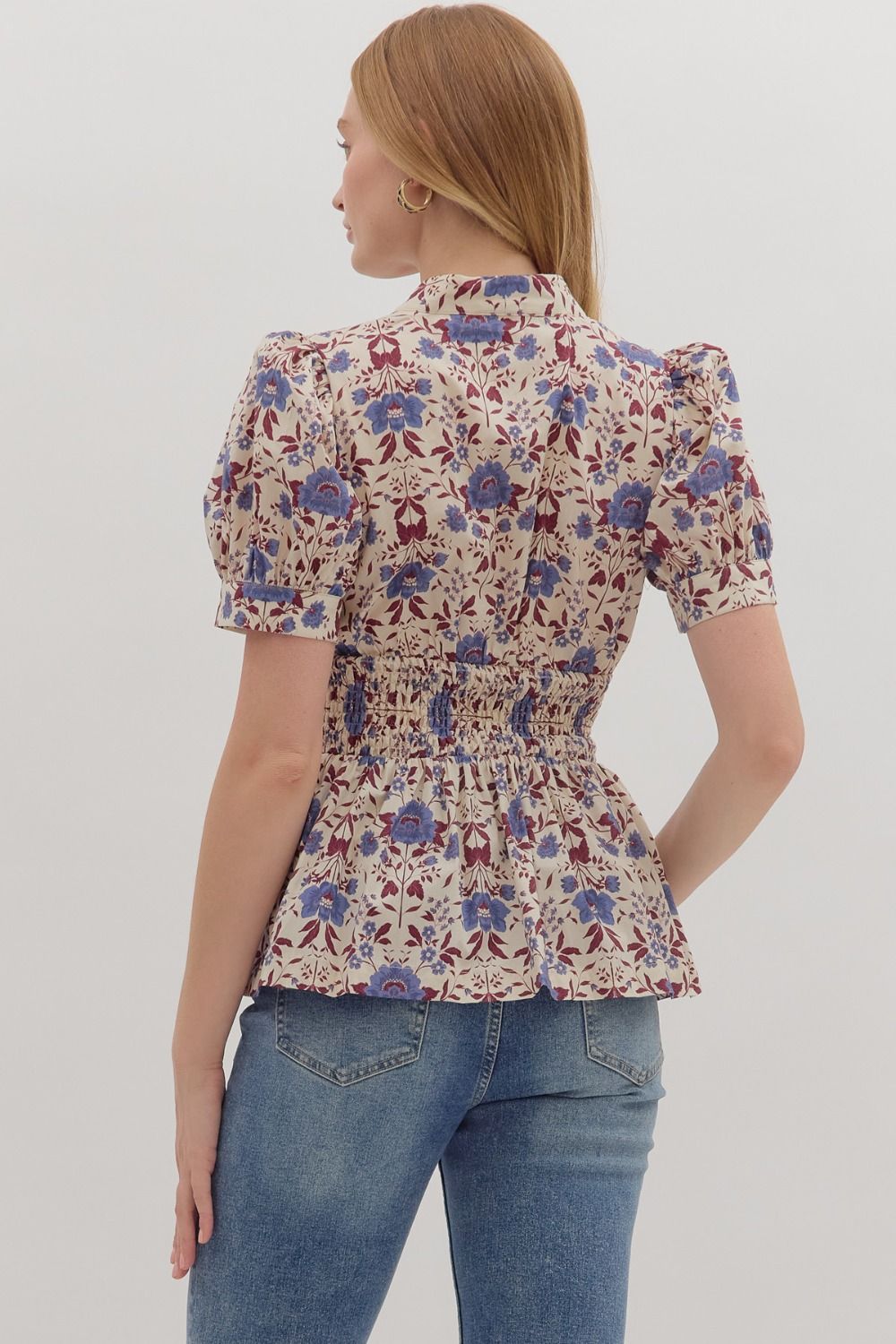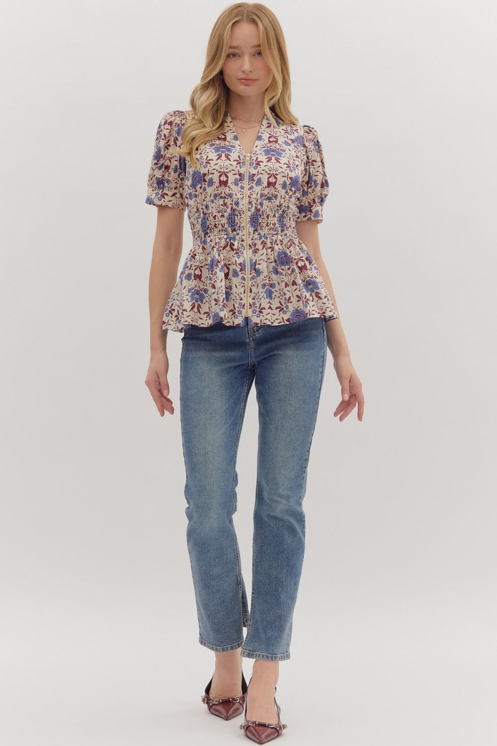 Bloom into style with the Fiona Floral Top, a playful piece that brings garden-fresh charm to your wardrobe. This delightful top features a vibrant floral print paired with romantic short puff sleeves that add a touch of whimsy. The flattering peplum silhouette creates dimension, while the wide smocked waist cinches you in just right for a polished look. A classic V-neck and convenient front zipper closure make it easy to slip on and go. Perfect for brunch dates, casual outings, or whenever you want to add a pop of personality to your day.