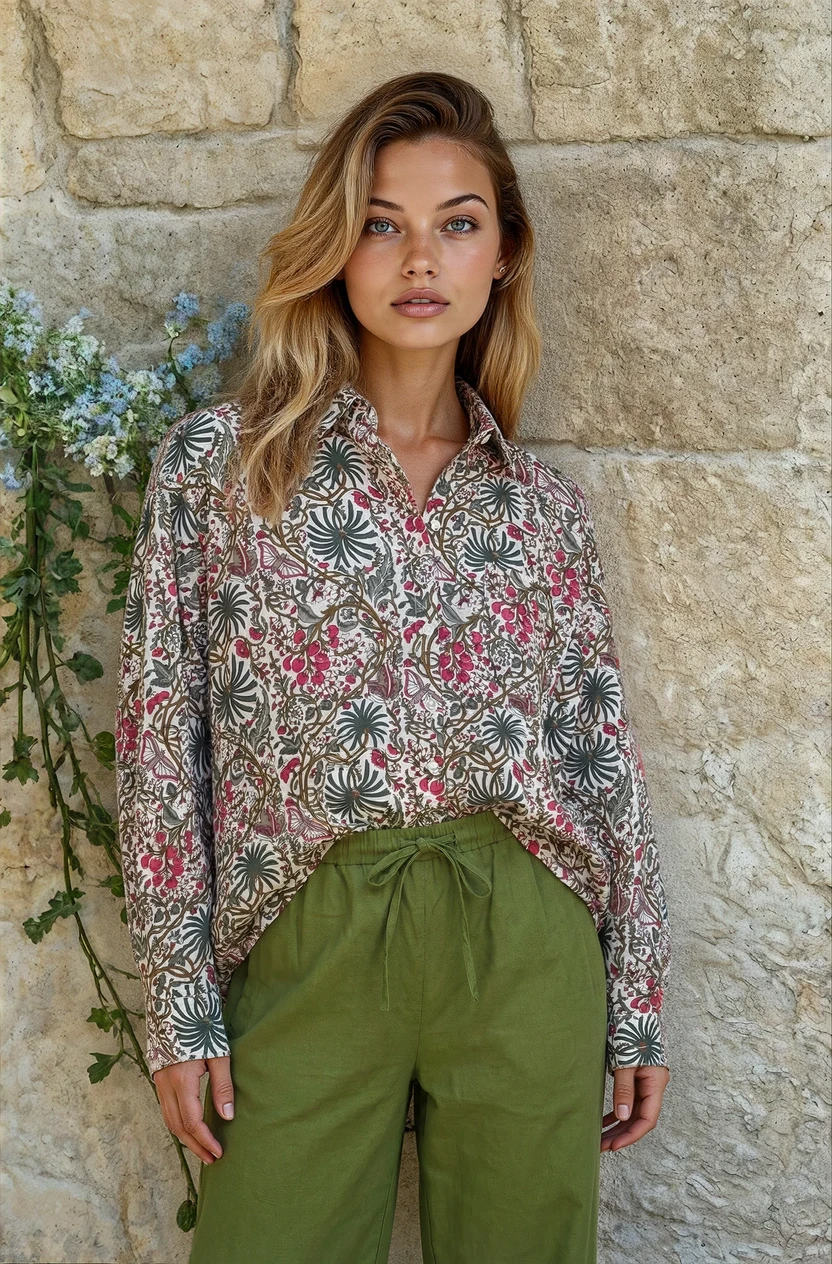 Meet your new favorite button down: the Good Boyfriend Shirt – Monarch Botanical. Crafted in 100% organic cotton and hand block printed, this piece blends effortless ease with a touch of botanical charm. Its relaxed, slightly oversized silhouette makes it easy to layer, while the crisp green color keeps things fresh and modern.