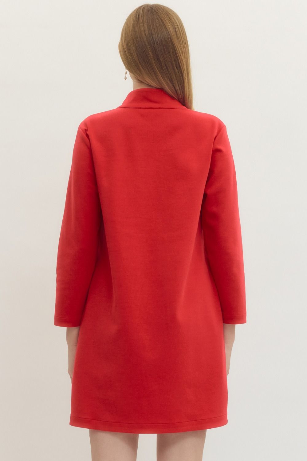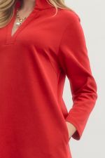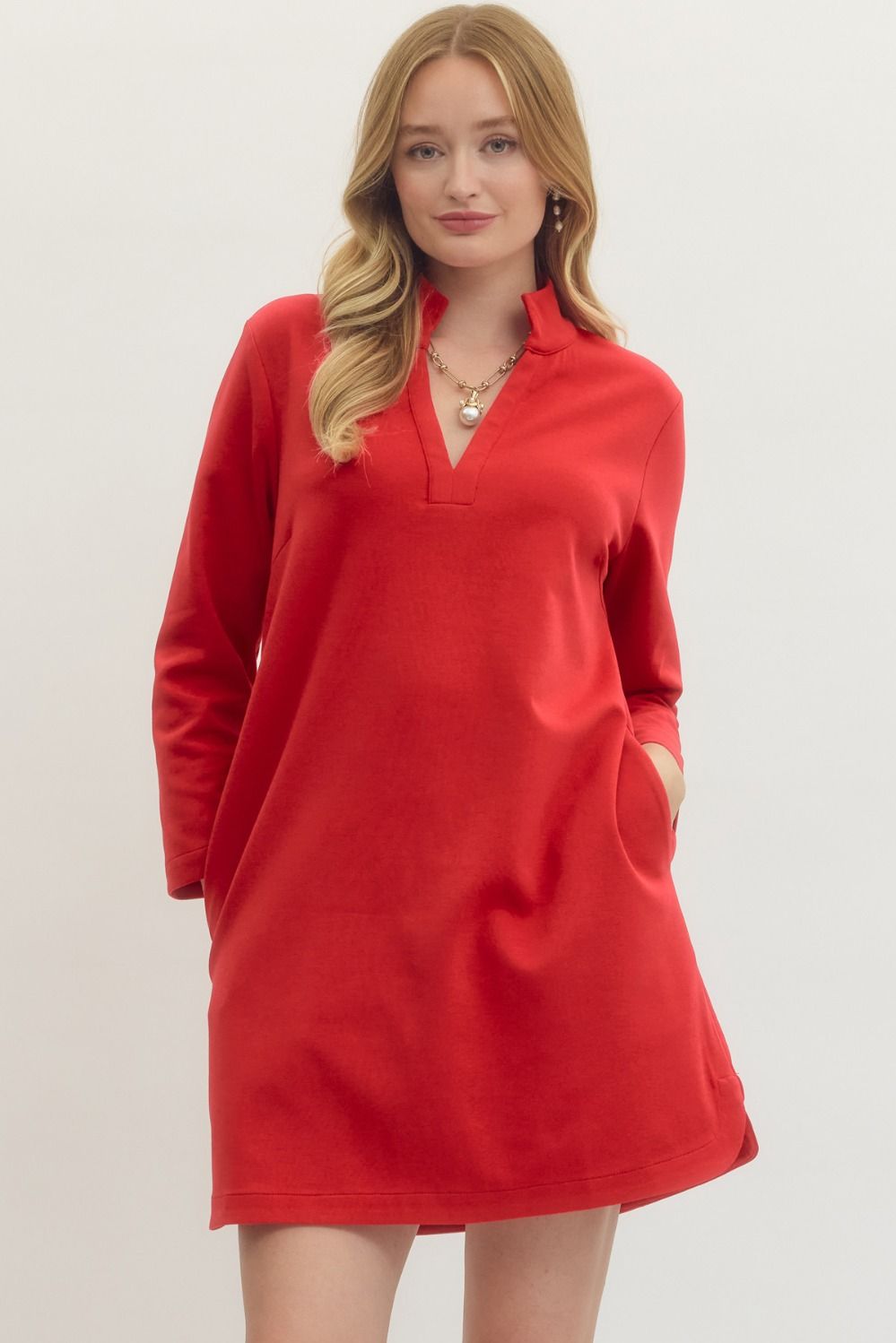Effortlessly chic and oh-so-comfy, the Harper Knit Mini Dress is your new go-to for looking put-together without trying too hard. This playful piece features a flattering split V-neck with a crisp stand collar, long sleeves for versatility, and practical side pockets because who doesn't love a dress that actually holds your stuff? The unlined knit fabric moves with you, making it perfect for everything from casual hangouts to weekend adventures. Simple, stylish, and seriously fun.