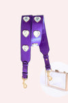 Elevate your game day style with the Jenna Purse Strap in vibrant purple! This adjustable crossbody strap features luxurious leather adorned with sparkling crystal hearts and chic gold hardware, bringing just the right amount of sparkle to your stadium look. Pair it with your favorite clear bag to turn heads and keep your essentials close in playful, standout style.