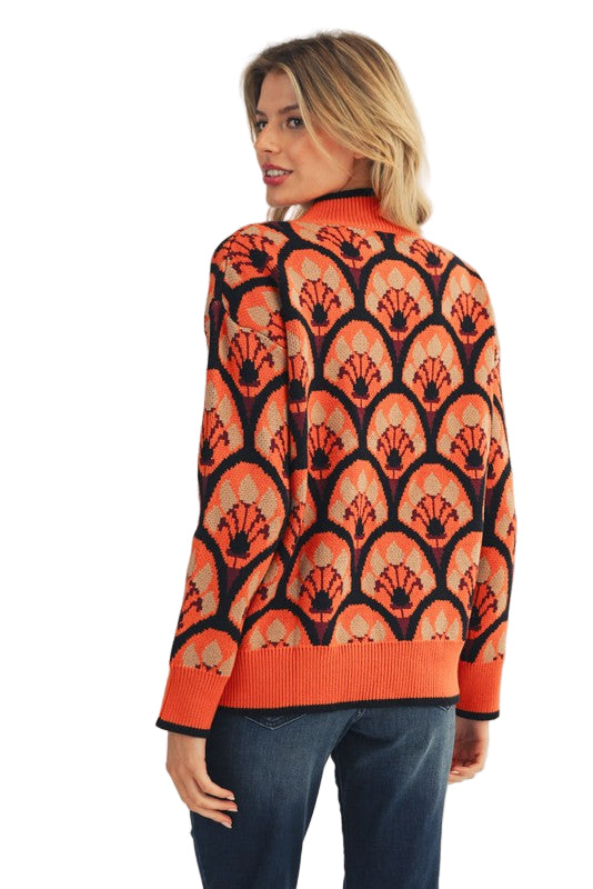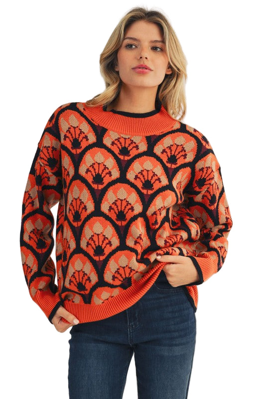 Add a playful twist to your fall wardrobe with this vibrant boho sweater. Featuring ribbed cuffs and hem, its lively mix of orange, wine, and black creates a striking pattern perfect for cozy days and crisp air. Embrace comfort and style effortlessly!