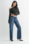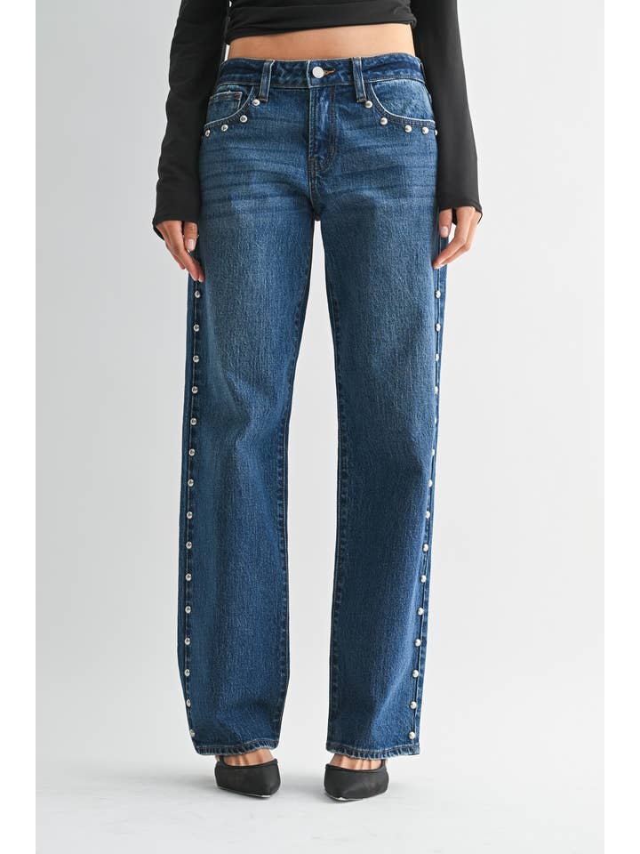 Rock a bold statement with these studded jeans that blend classic denim vibes with contemporary edge. Featuring eye-catching studs running down the side seams, these dark blue jeans deliver that coveted silhouette with a relaxed, roomy fit. The 9" rise and 29" inseam create an effortlessly cool look, while the 9.25" opening gives you that perfect full leg drape. Perfect for anyone ready to turn heads and own their style with confidence.