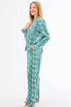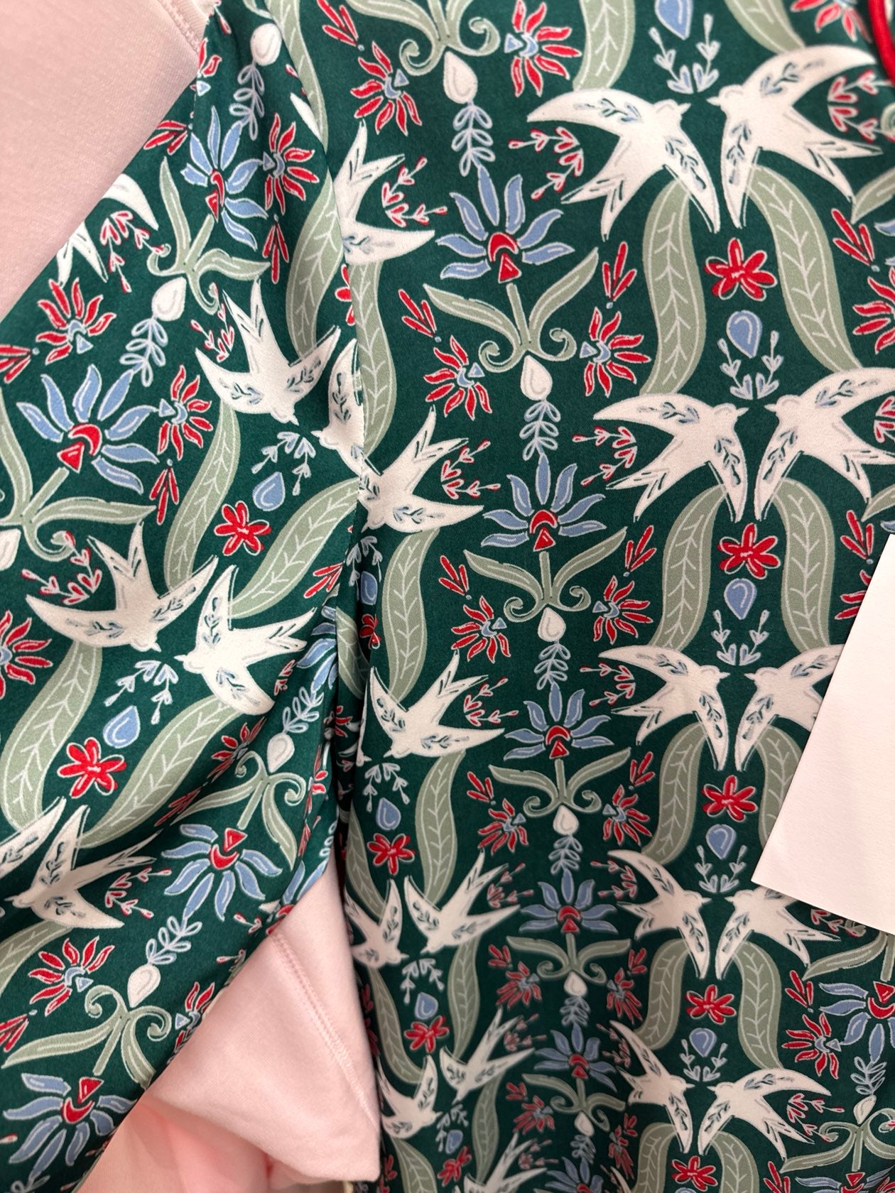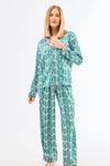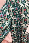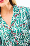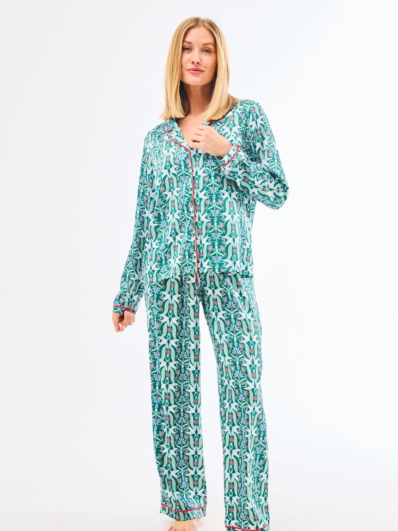 Slip into the Charlotte Gossamer Wing Pajama and feel as light as a feather. This soft two-piece set features a classic shirt and long pants, both piped in vibrant red for a playful pop. The green fabric is adorned with a charming bird motif, adding a whimsical touch to your bedtime routine. Perfect for dreamy nights and cozy mornings alike.