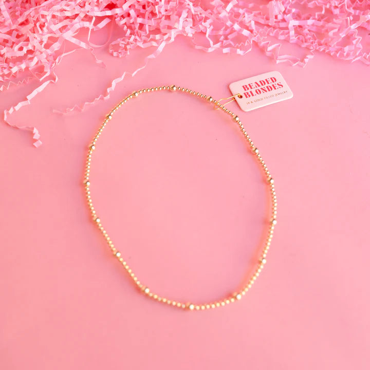 Strung with a mix of 3MM and 5MM 14k gold-filled beads, this necklace is your new everyday essential. The durable elastic string keeps it secure through workouts, beach days, and everything in between—sweat, water, and tarnish won't stand a chance. Lightweight, comfortable, and always ready to shine, it's the kind of piece you'll reach for again and again. Hand strug in Texas.