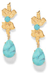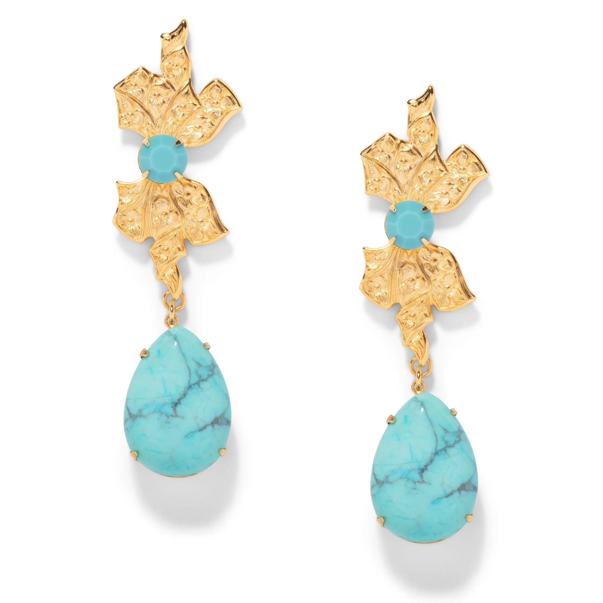 These 3” long Opera Earrings bring a splash of sparkle to any look. Featuring a charming floral bow adorned with shimmering turquoise crystals, each earring dangles gracefully, finished with a delicate pear-shaped drop. Crafted in the USA with an 18k gold finish, nickel-free and equipped with surgical steel posts, they’re as comfortable as they are dazzling. Perfect for adding a playful pop of color to your outfit!