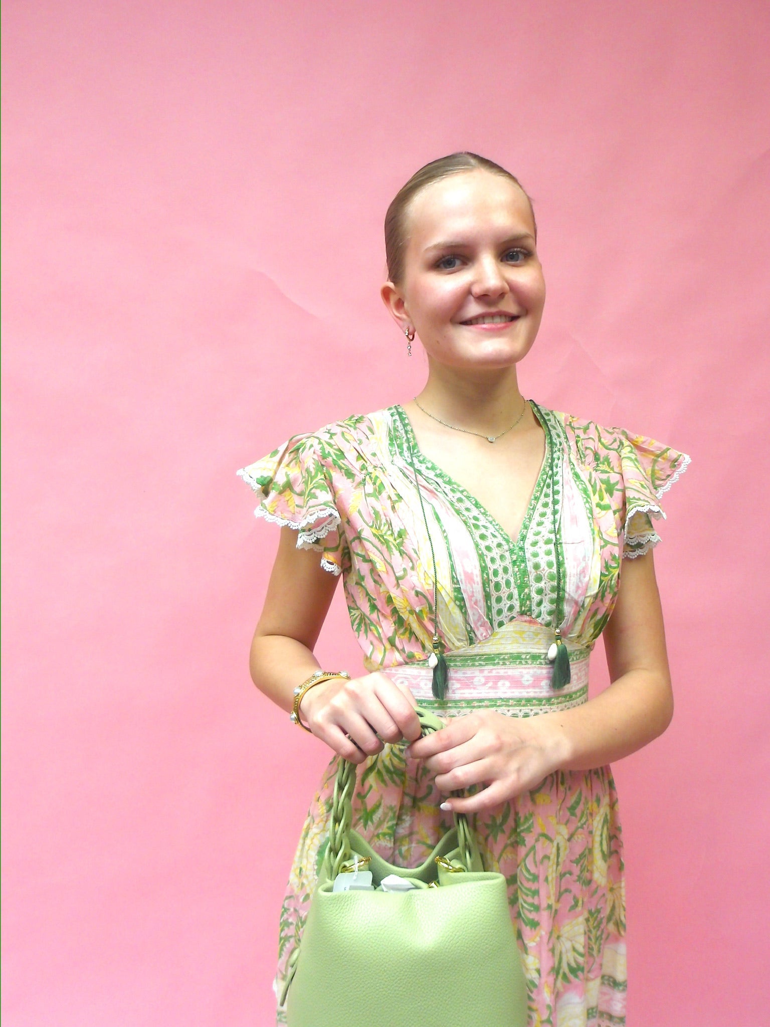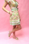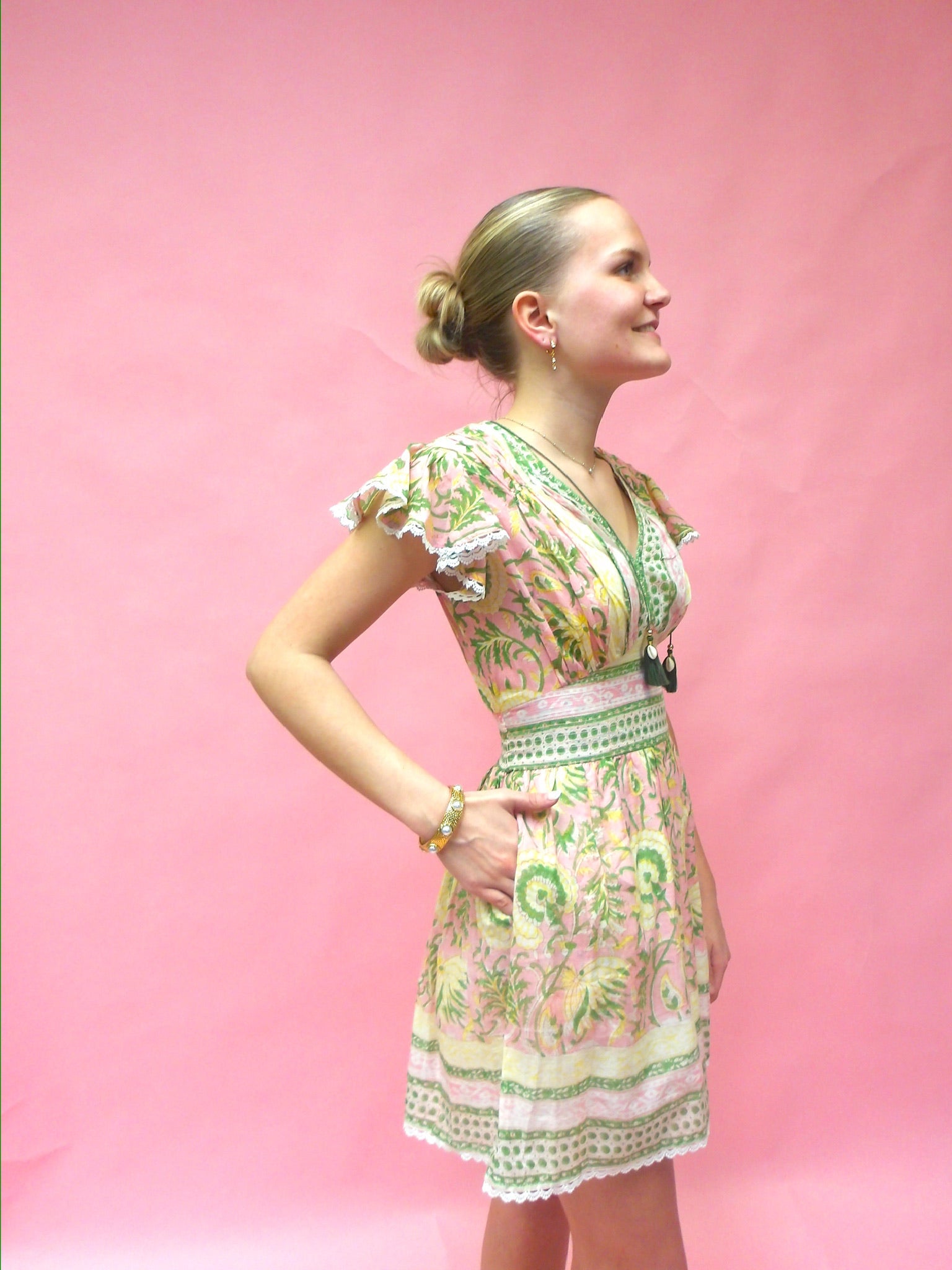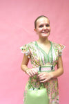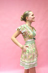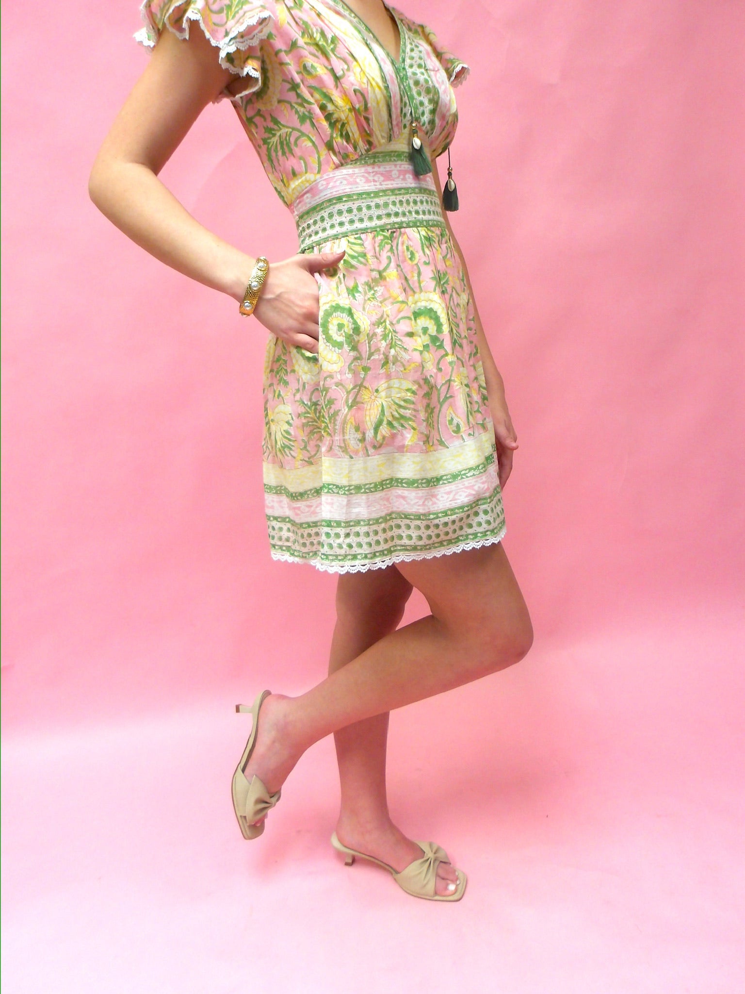 Brighten your warm-weather wardrobe with this charming mini dress featuring a vibrant green, pink, and yellow floral print. The lightweight cotton construction keeps you cool and comfortable, while the flattering V-neckline and flutter sleeves add feminine flair. Adjustable ties at the top provide a customizable fit. Perfect for casual outings, garden parties, or any occasion that calls for effortless style!