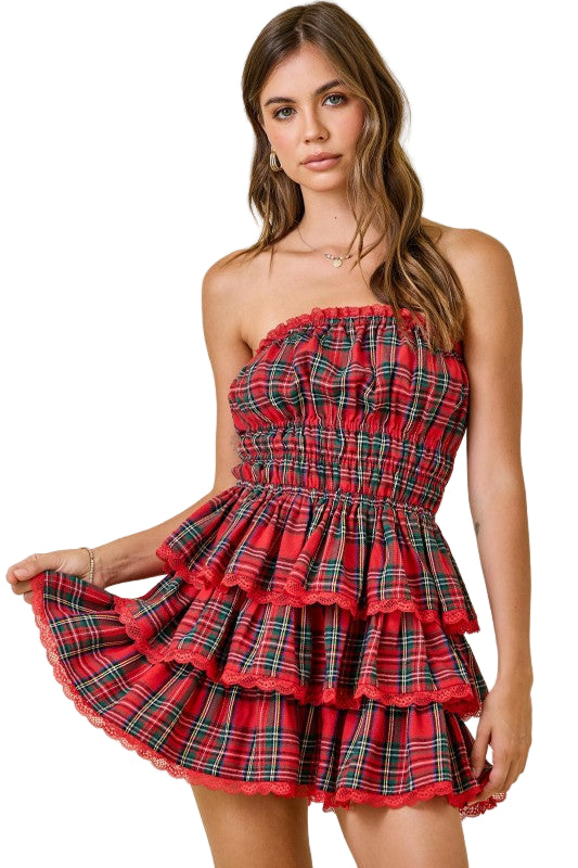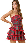 Get festive in this adorable glen plaid strapless mini dress that's as comfortable as it is cute! Soft, cozy fabric keeps you feeling great throughout the holiday season, while built-in shorts provide the perfect amount of coverage for worry-free movement and fun. The strapless neckline is your canvas for showing off statement earrings or your favorite necklaces. Whether you're rockin' around the tree or celebrating at a holiday party, this playful dress brings Christmas cheer with style and comfort.