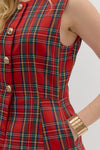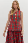 Step into the holiday spirit with this playful plaid sleeveless vest top! Featuring a fitted silhouette, gold accent buttons, and handy side pockets, it’s lined for comfort and style. Perfect for adding a festive touch to your Christmas party outfit.