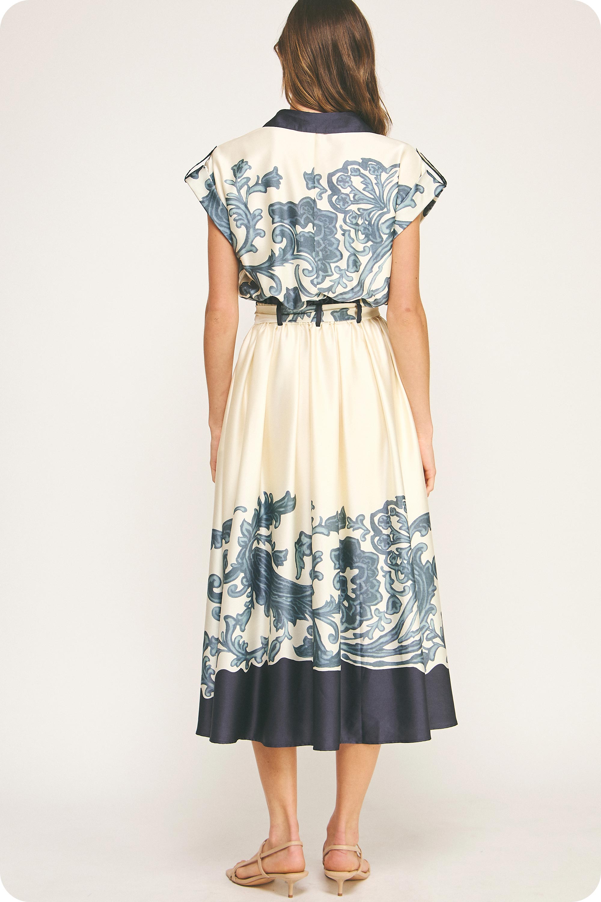 Experience refined elegance with the Midnight Moon Dress, featuring a sleek satin finish that catches the light beautifully. Its navy trim and scattered bold print add sophistication, while the tie belt at the waist enhances your silhouette. Designed with a long skirt and short cap sleeves, this dress offers a graceful balance of comfort and style, perfect for daytime luxury.