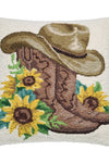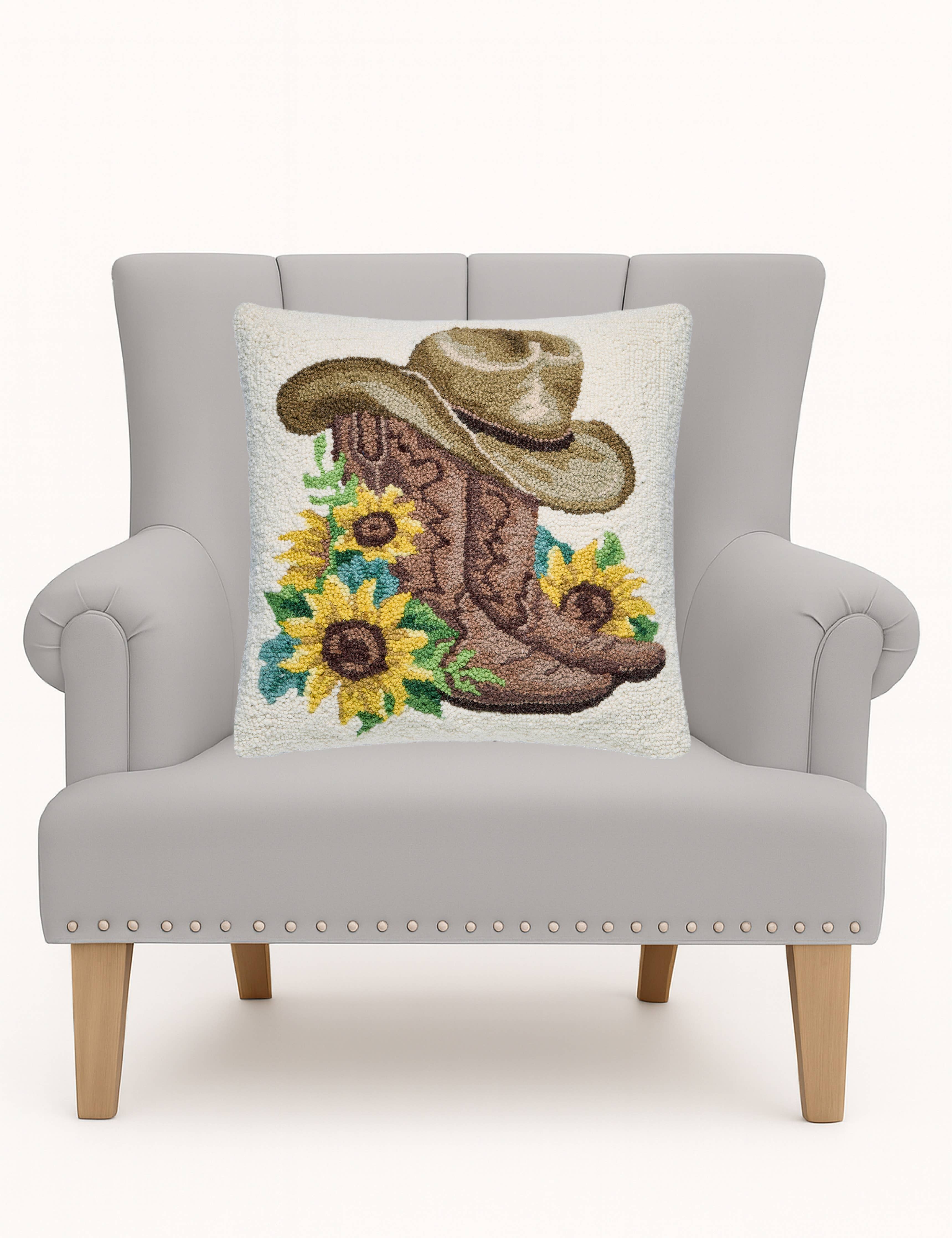 Sunflower Boots Hook Pillow—a cheerful addition to any room! Crafted from 100% wool with a plush 100% polyester velvet back, this 18x18" throw pillow brings warmth and whimsy to your space. The durable hooked design features charming sunflower boot details that'll brighten your décor. Includes a cozy polyester insert and convenient zipper closure for easy care. Perfect for cozying up on the couch or adding a pop of personality to your bedroom.