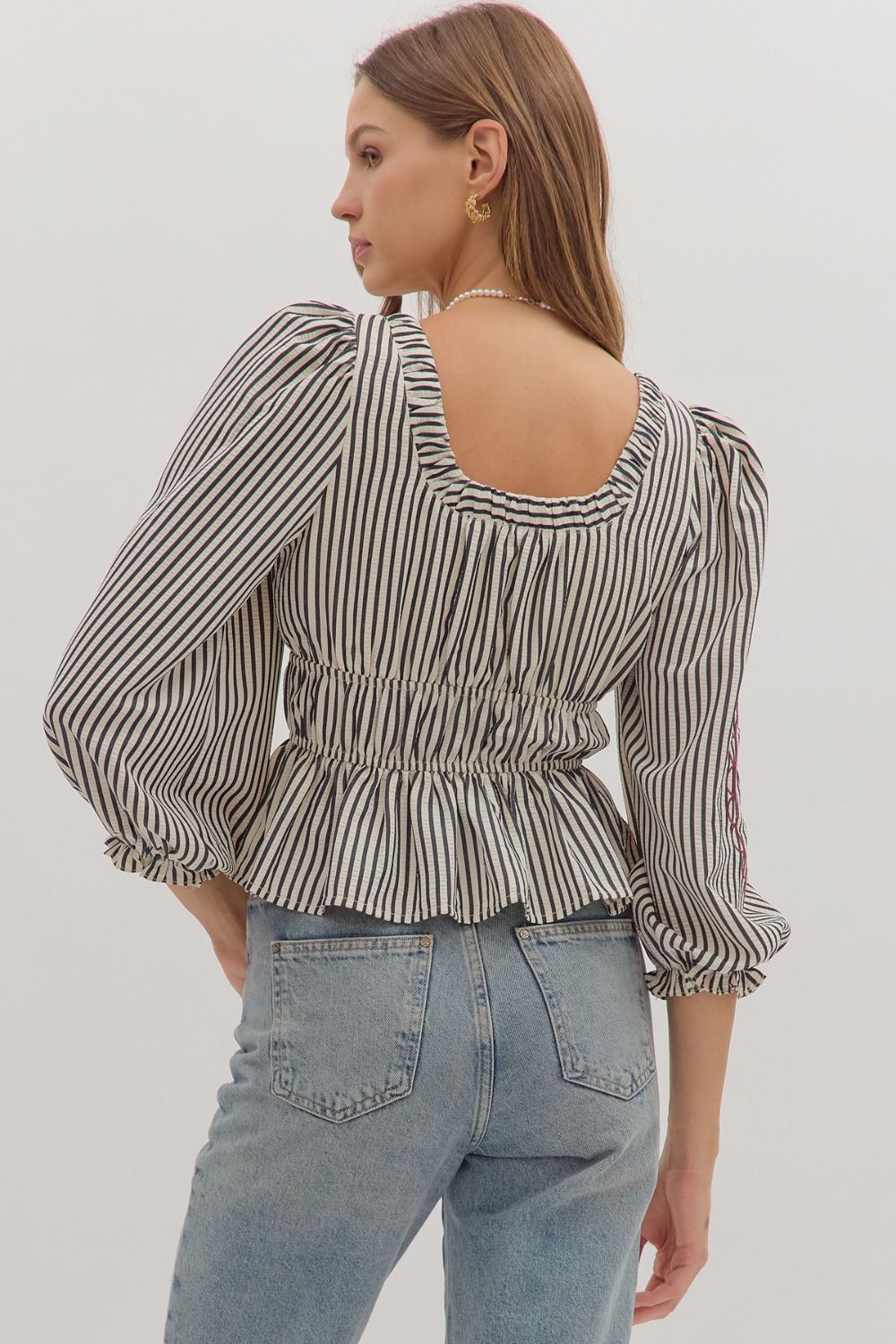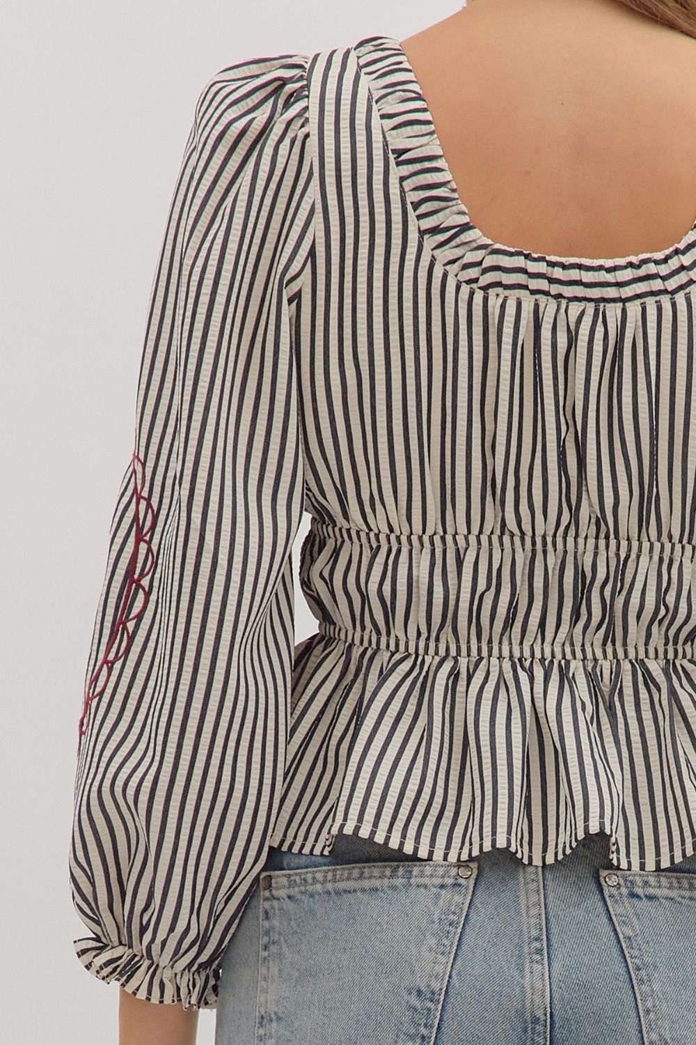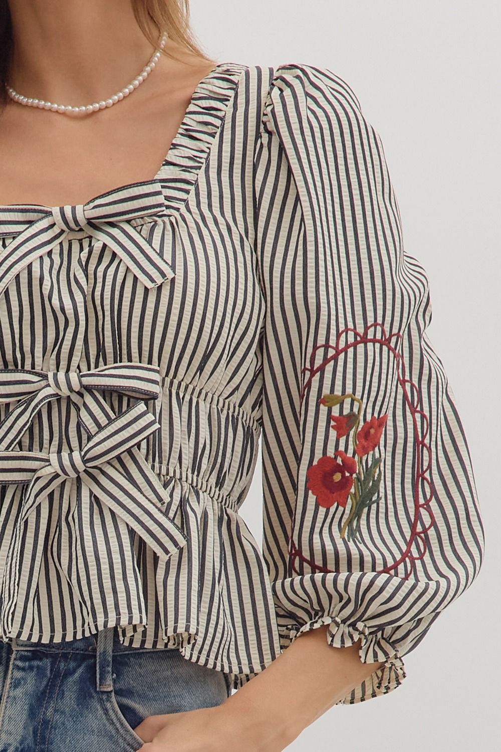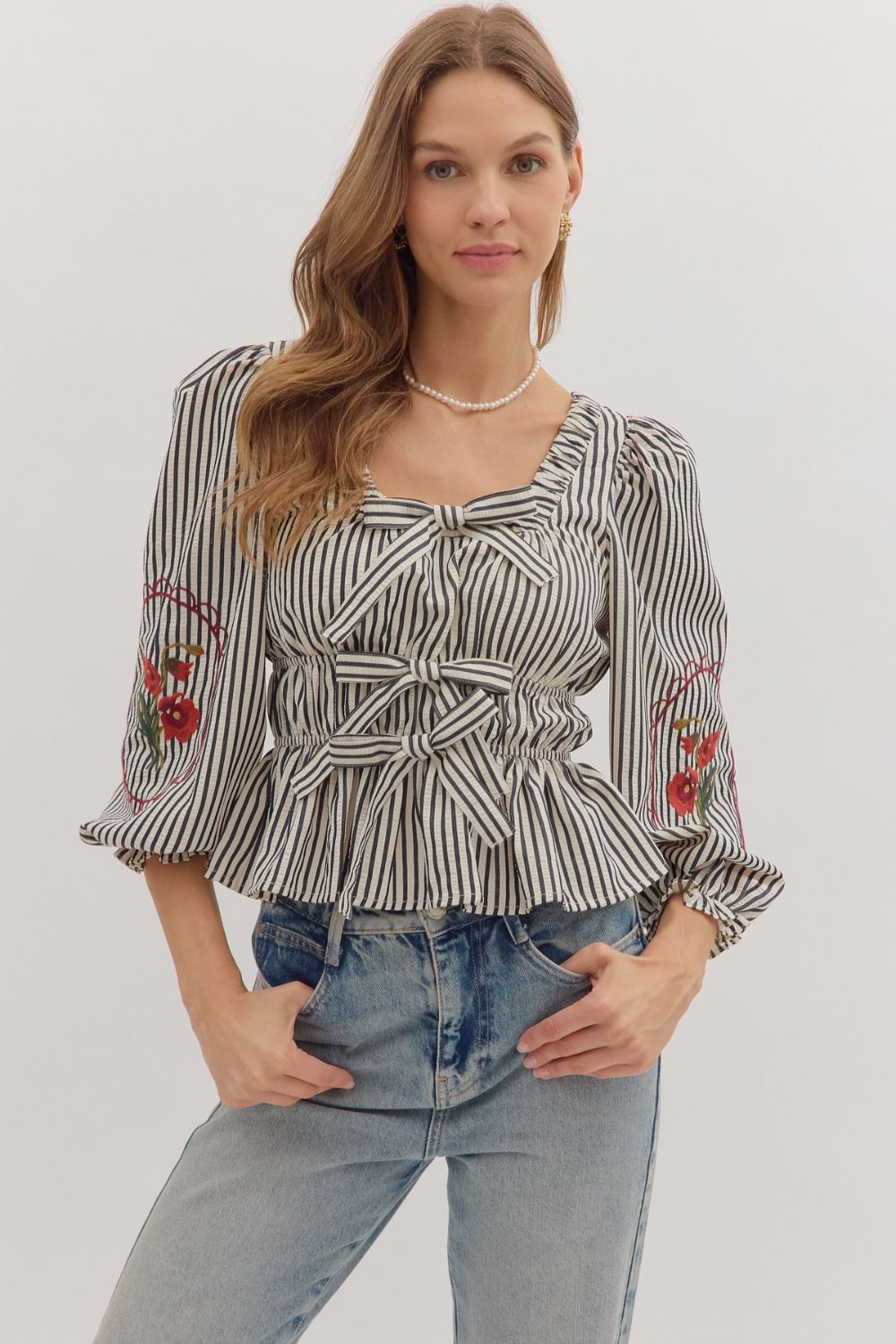 This playful long sleeve top features vibrant stripes, a flirty peplum shape, and charming floral embroidery on the sleeves. The front self-tie adds a sweet, adjustable touch, while elasticated hem and cuffs ensure a comfy fit. Lightweight and unlined, it’s perfect for effortless style with a fun, feminine twist.