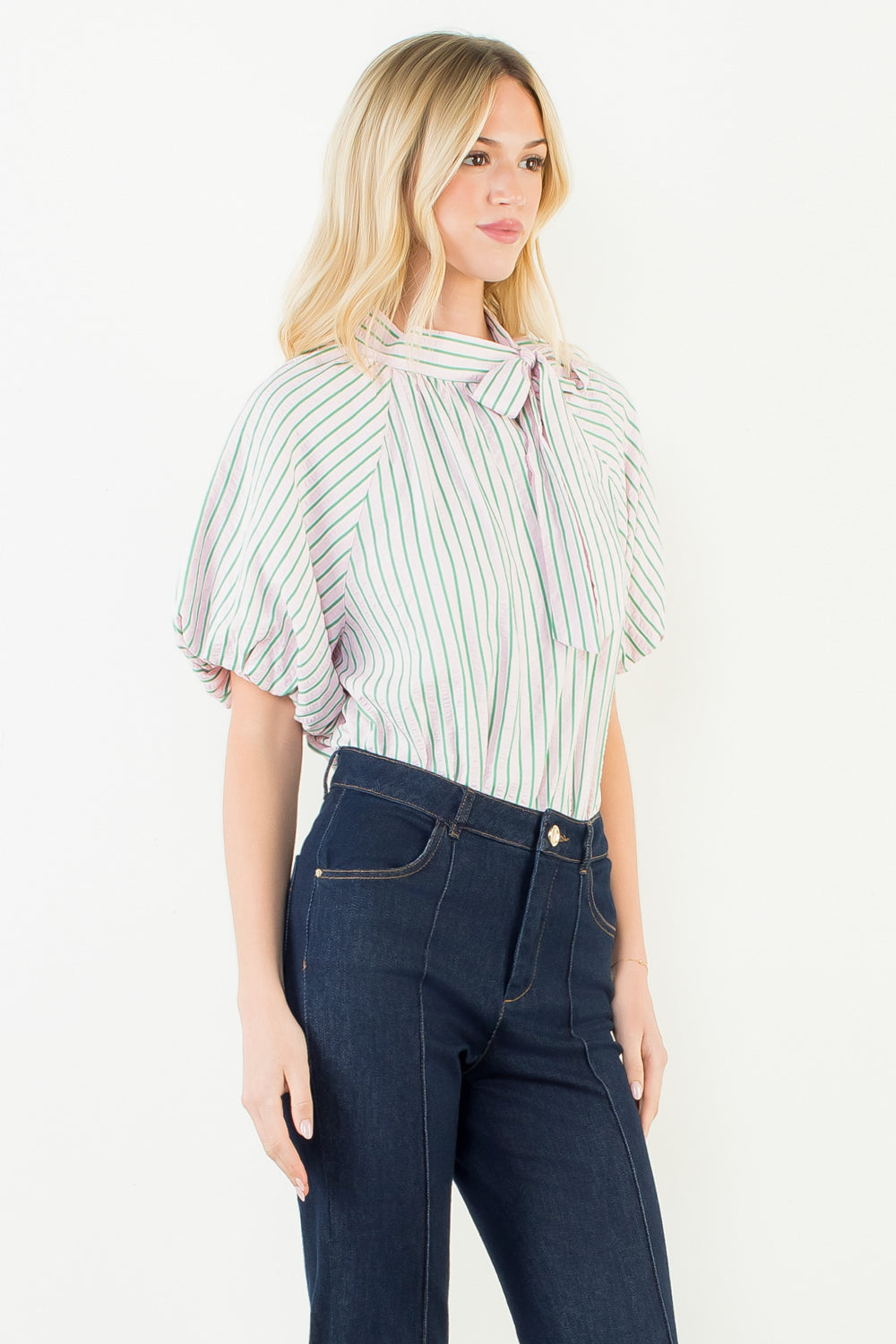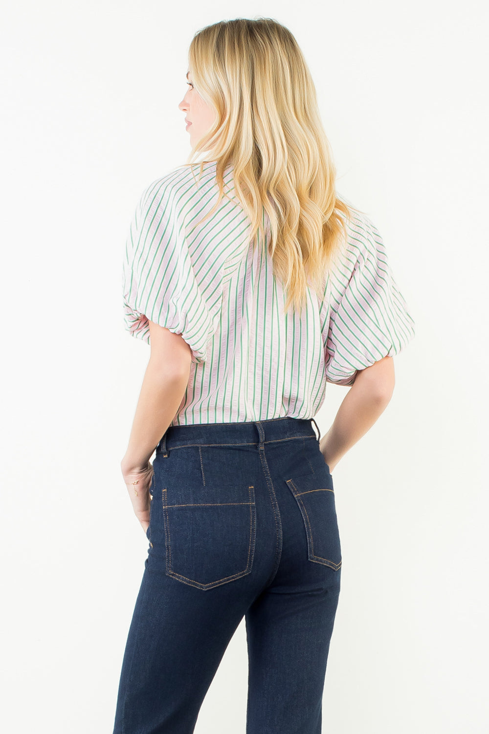Brighten your wardrobe with the Pink Lemonade Blouse, a charming striped top that transitions seamlessly from office to evening. Featuring a cheerful pink and green stripe pattern, this blouse showcases delicate puff sleeves and a sweet bow detail at the neckline for an effortlessly polished look. Whether you're heading to work, running errands, or stepping out for a night on the town, this versatile piece brings a pop of color and personality to any outfit. A wardrobe essential that's as fun as it is functional!